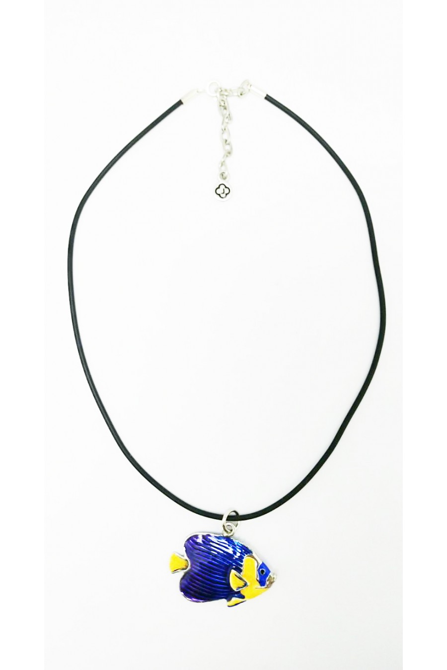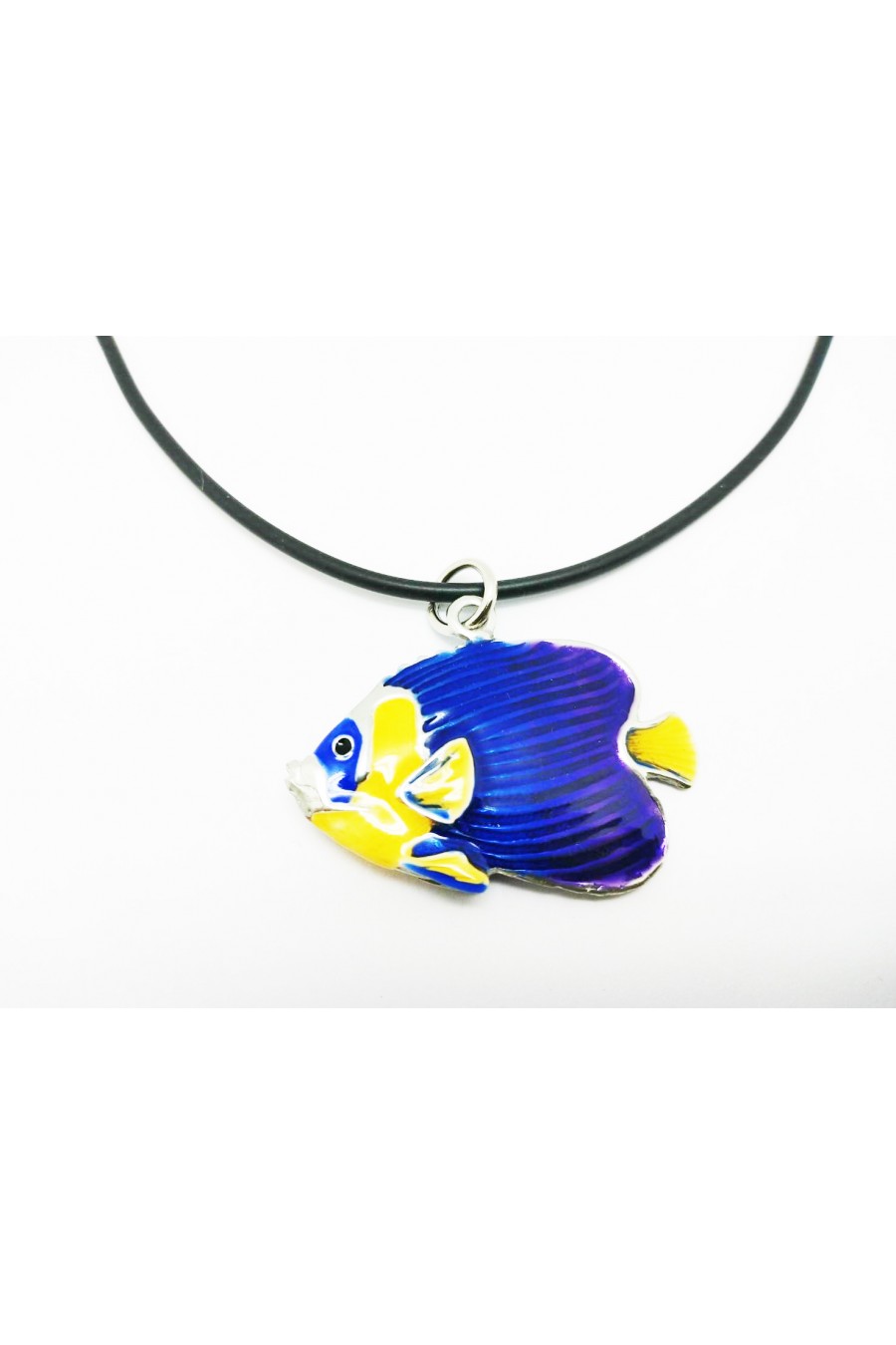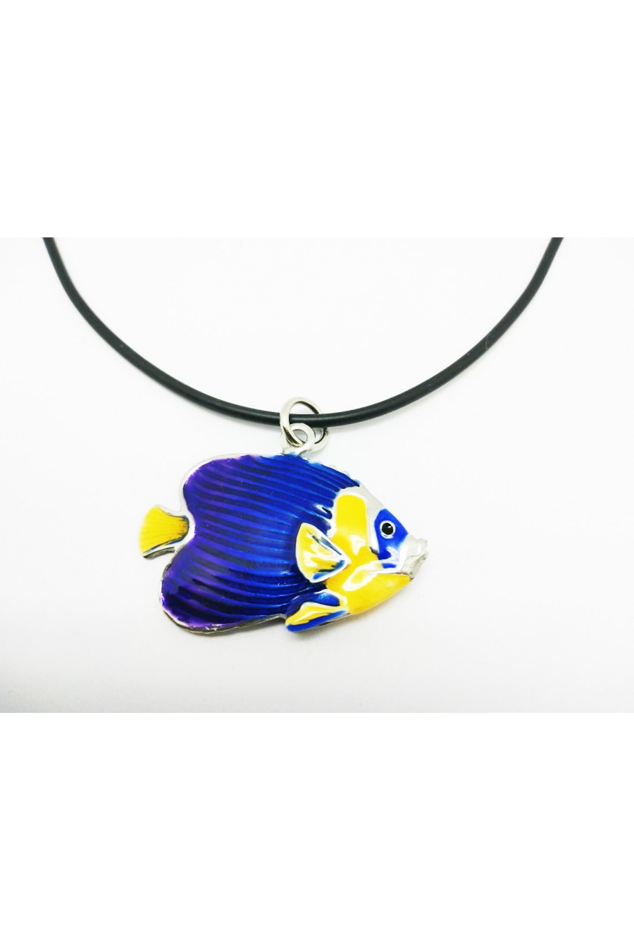 Colgante forma de pez mariposa de aleación de estaño. Acabado pulido natural y decorado en esmalte azul y naranja. El regalo perfecto para los amantes del mar.