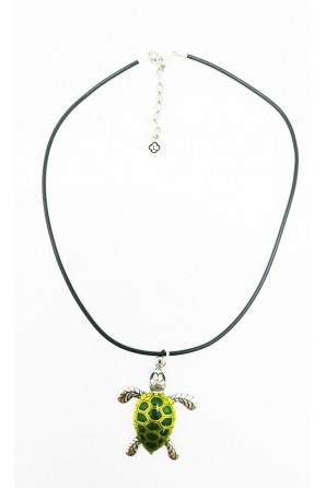 Colgante forma de tortuga de aleación de estaño. Acabado pulido natural y decorado en esmalte verde. El regalo perfecto para los amantes del mar.