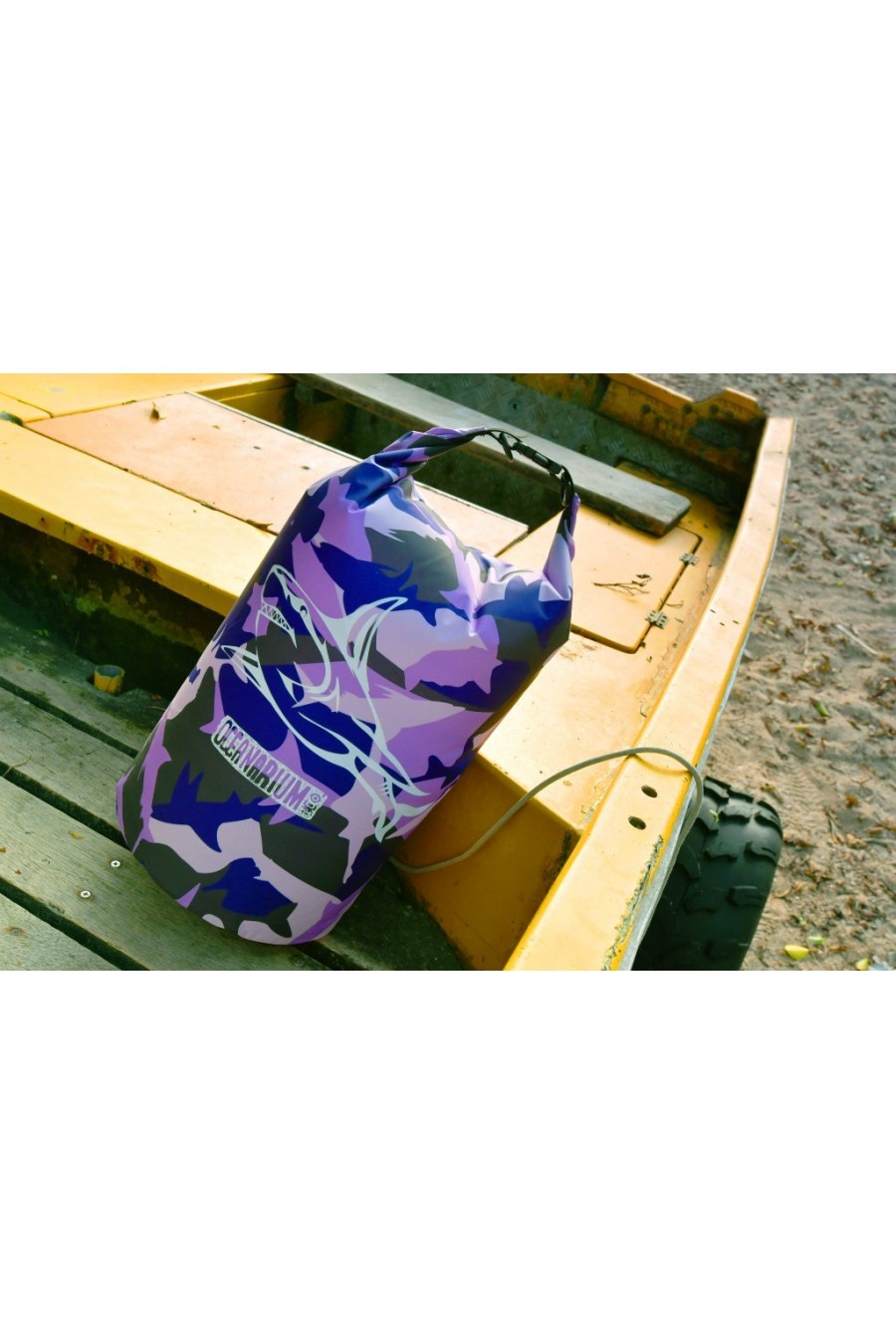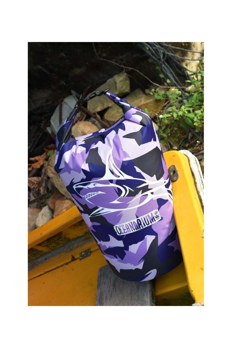 Original wasserdichte Taschen in Hai-Tarnung in zwei Größen gestempelt: 5 und 15 Liter. Vier lustige Farben mit jeweils einer großen Zeichnung einer Hai- oder Fischart: Fuchshai, Weißer Hai, Walhai, Hammer, Tiger, Stier oder Marlinfisch.