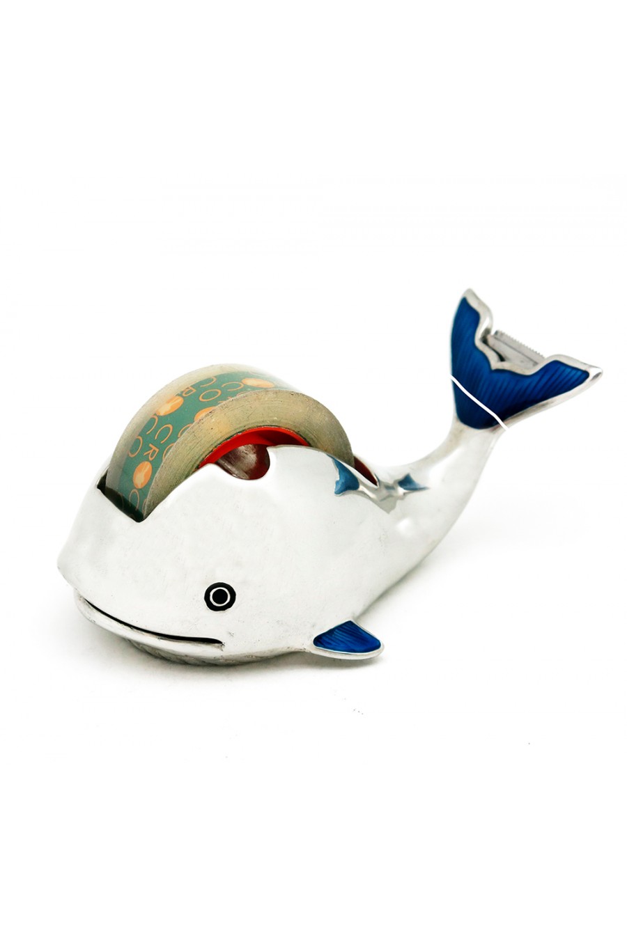 Ein innovativer und lustiger Klebebandspender in Form eines Wals aus einer Zinnlegierung. Natürlich poliertes Finish mit roten und blauen Emaille-Akzenten. Ein charmanter und funktionaler Artikel, der Ihrem persönlichen Arbeitsplatz etwas Einzigartiges und Lustiges hinzufügt.