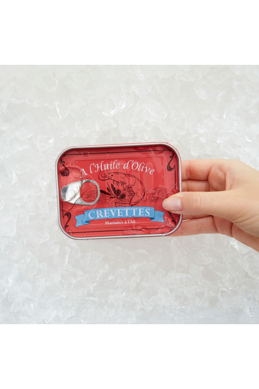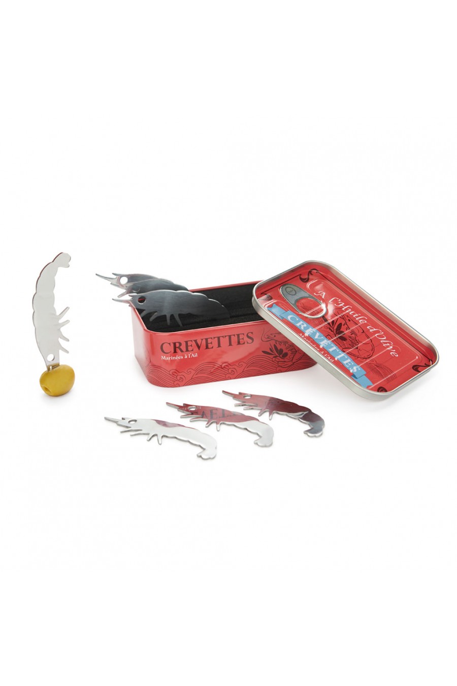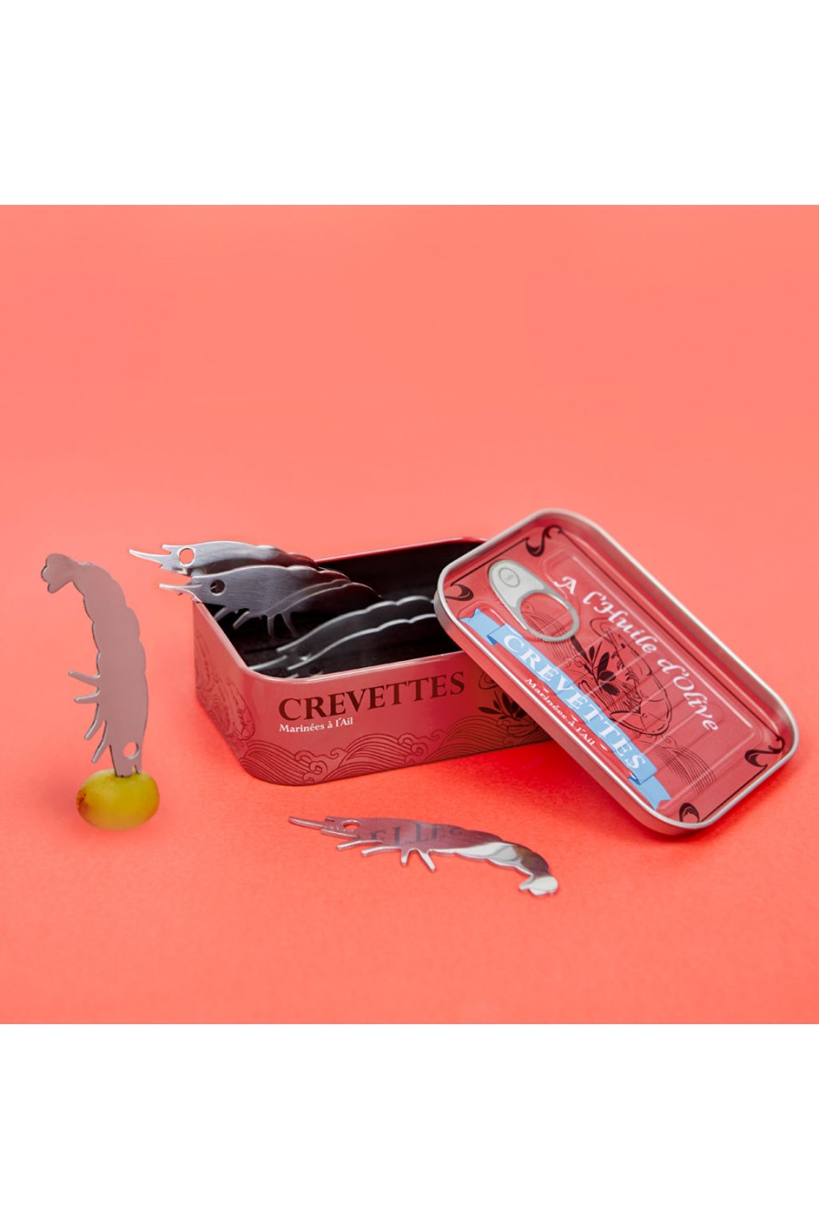 ORIGINELLES DESIGN. Lustiges Retrodesign, eine Krevetten-Konservendose darstellend. Jede Dose verfügt über sechs 8 cm lange Gabeln in Form einer Krevette.