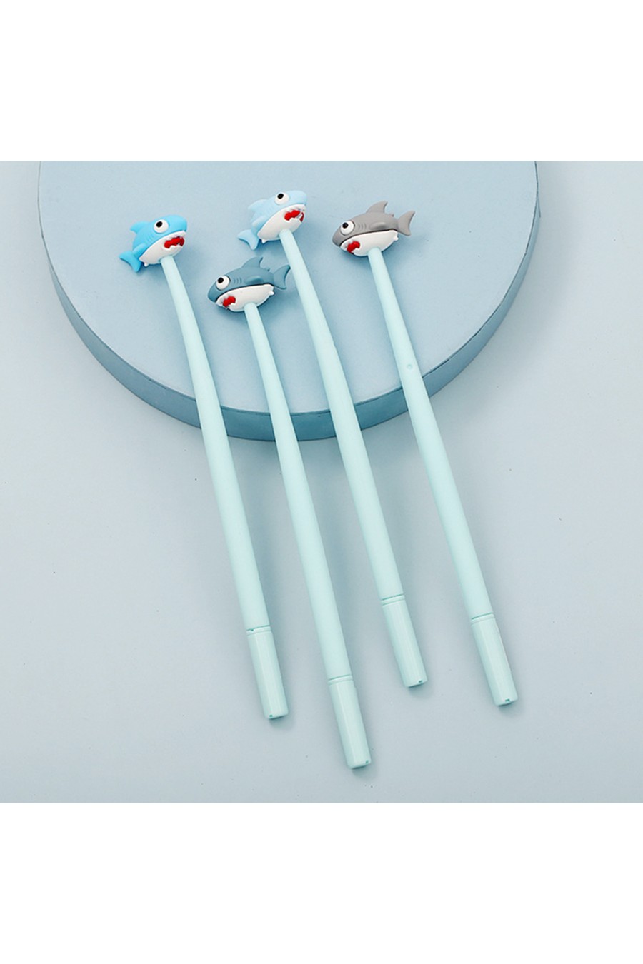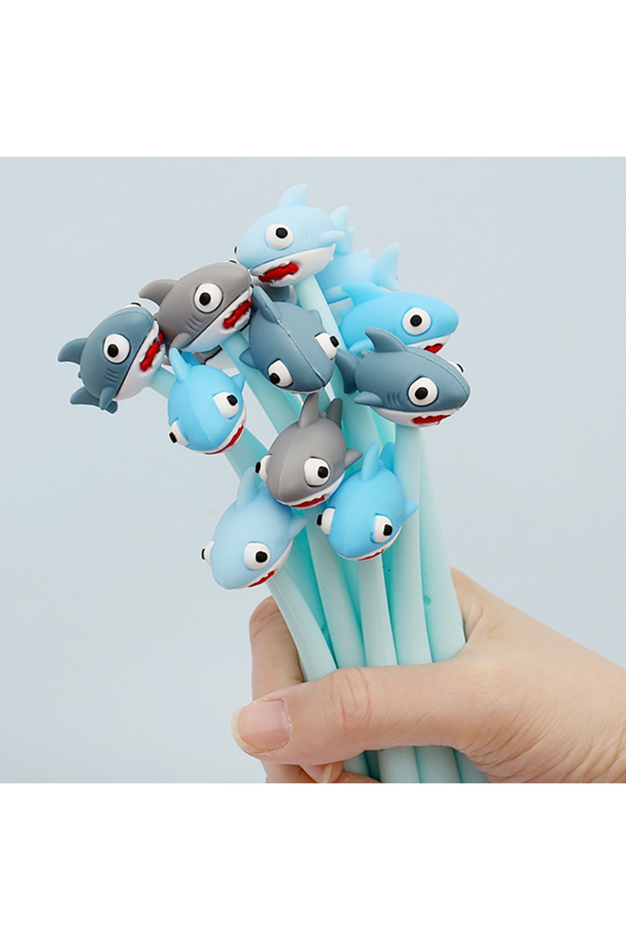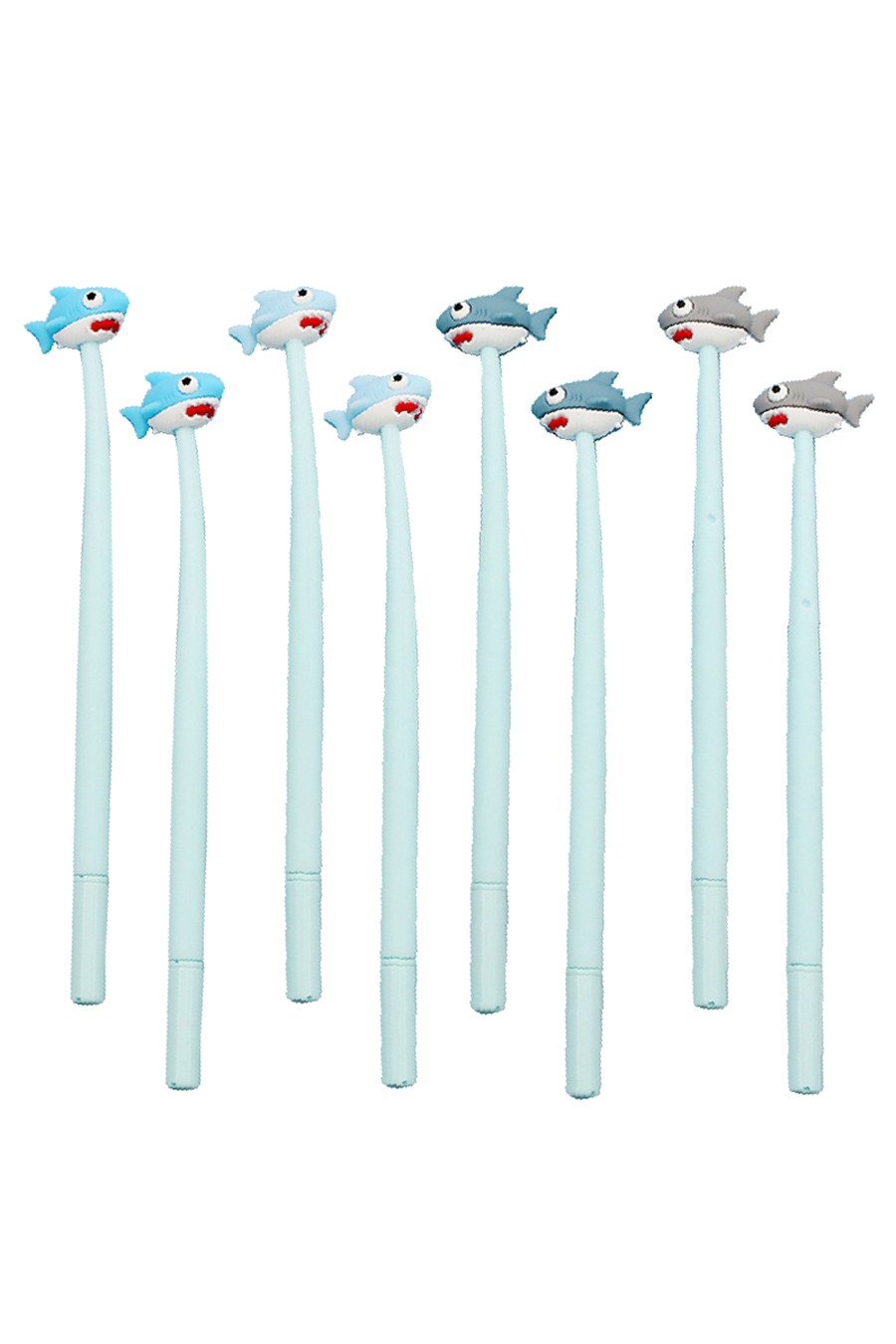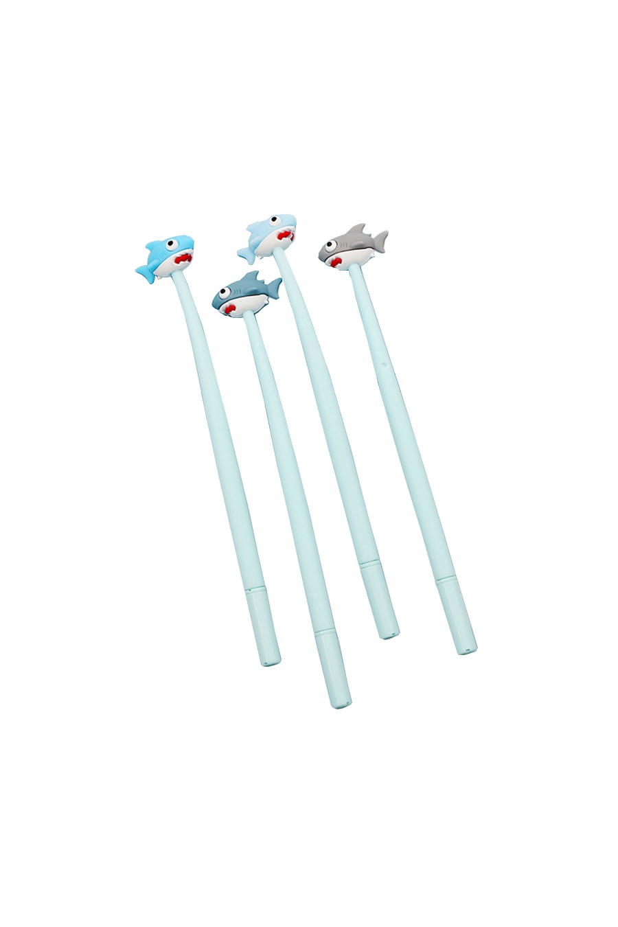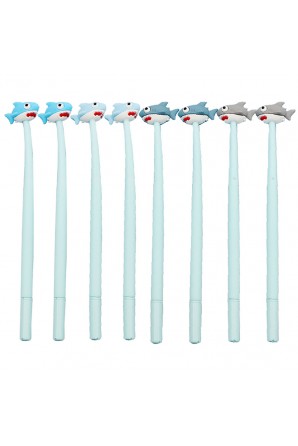 Divertidos bolígrafos de gel con tiburón de goma en su extremo.