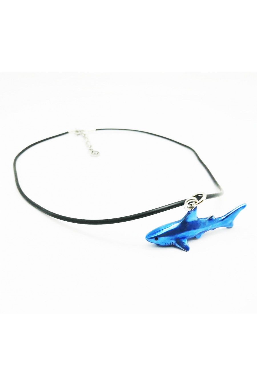 Colgante forma de tiburón de aleación de estaño. Acabado pulido natural y decorado en esmalte azul traslúcido. El regalo perfecto para los amantes del mar.