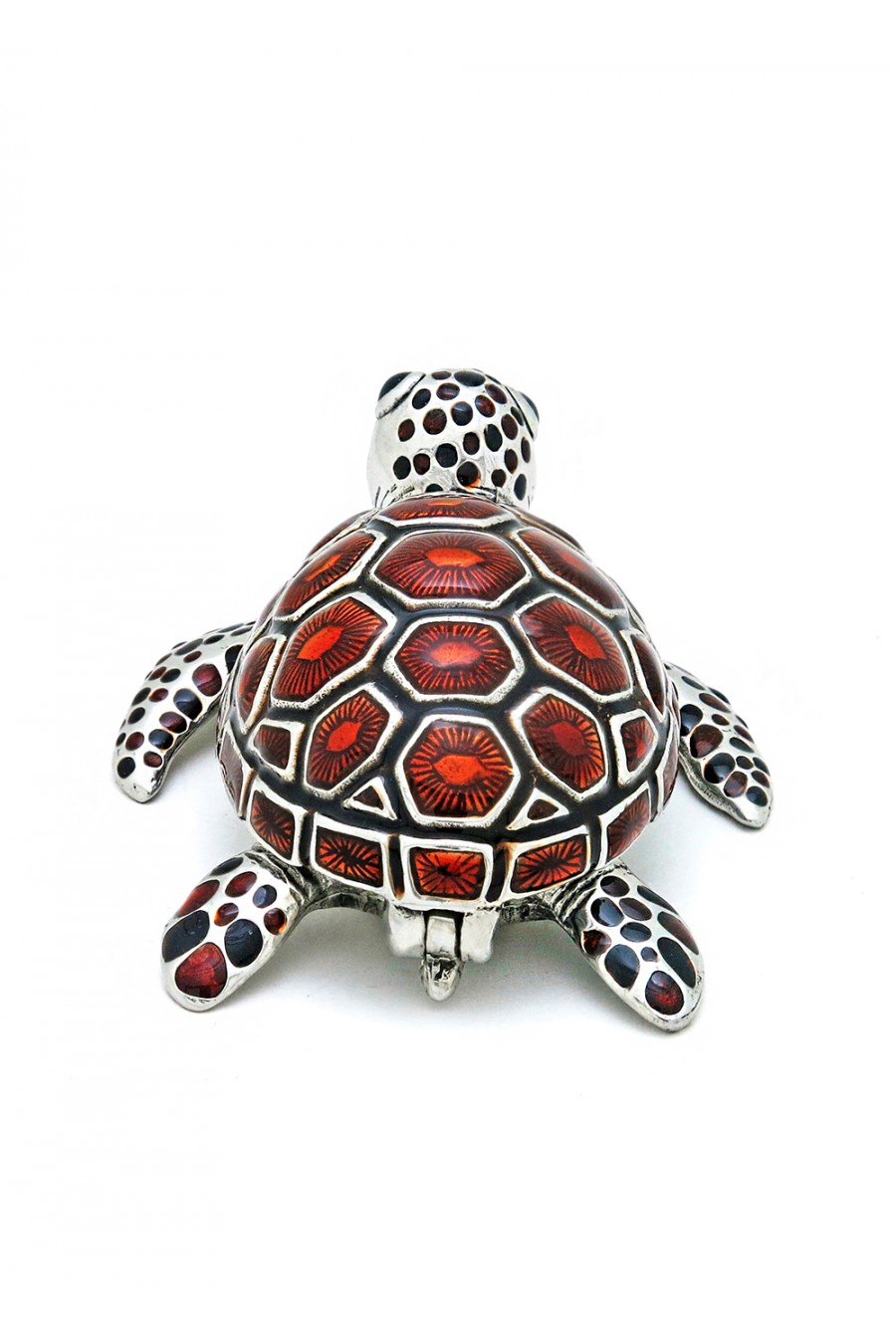 L'intérieur de la boîte est recouvert d'émail rouge translucide. La carapace, les nageoires et la tête sont ornées de nuances d'émail vert ou rouge translucide.