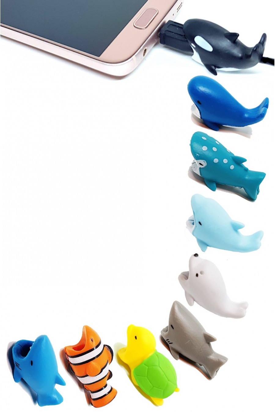 Fun and original cable protectors with 7 different shapes: Whale shark, Clown fish, Gray shark, Dolphin, Blue shark, Whale and Seal.