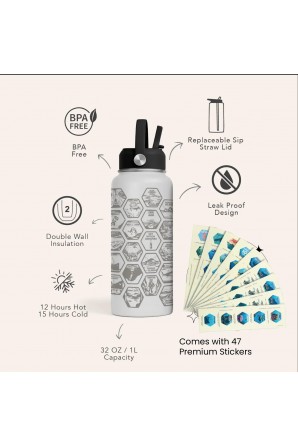 - Capacità 1 l - Acciaio inossidabile senza BPA - Tappo con cannuccia sostituibile - Design a prova di perdite - Isolamento a doppia parete - 12 ore di caldo / 15 ore di freddo - Include 47 adesivi premium per tracciare i tuoi viaggi.