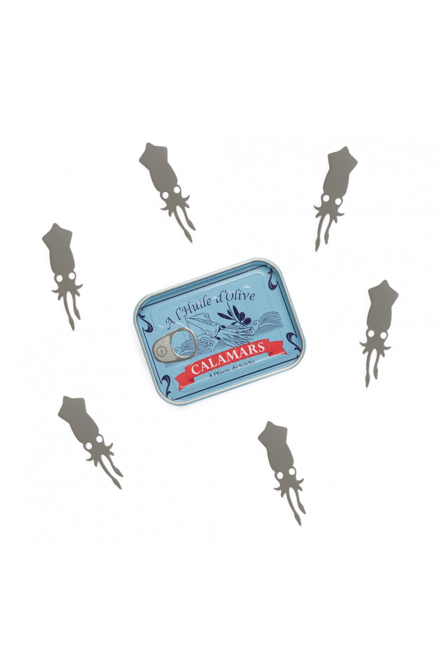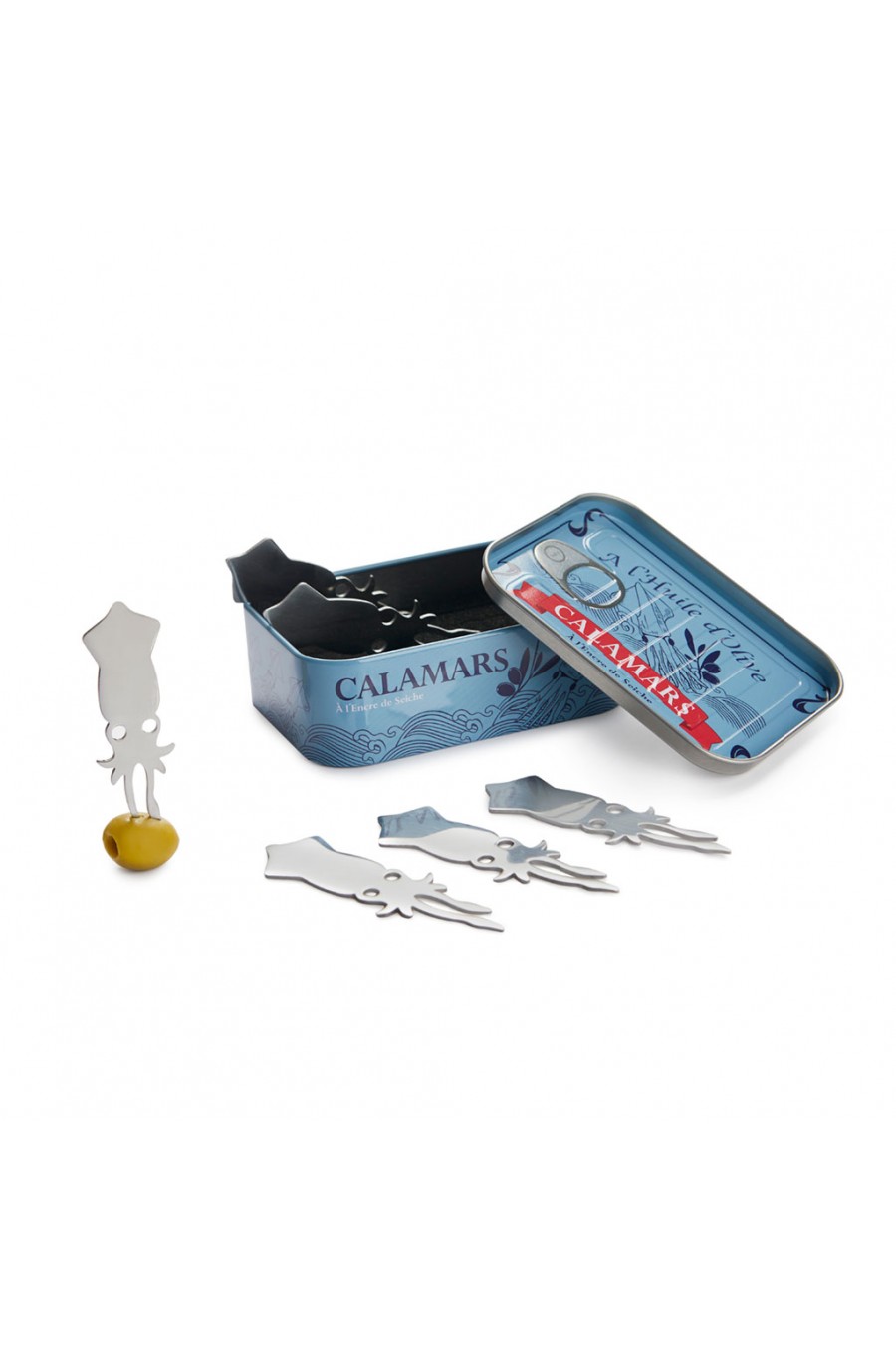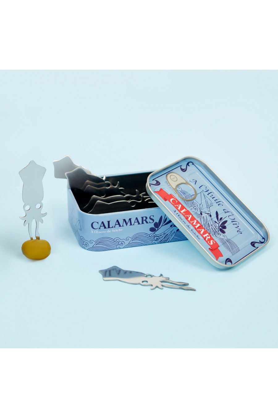 ORIGINAL DESIGN. Retro and fun design that simulates a can of canned squid. Includes 6 squid-shaped forks of 8 cm.