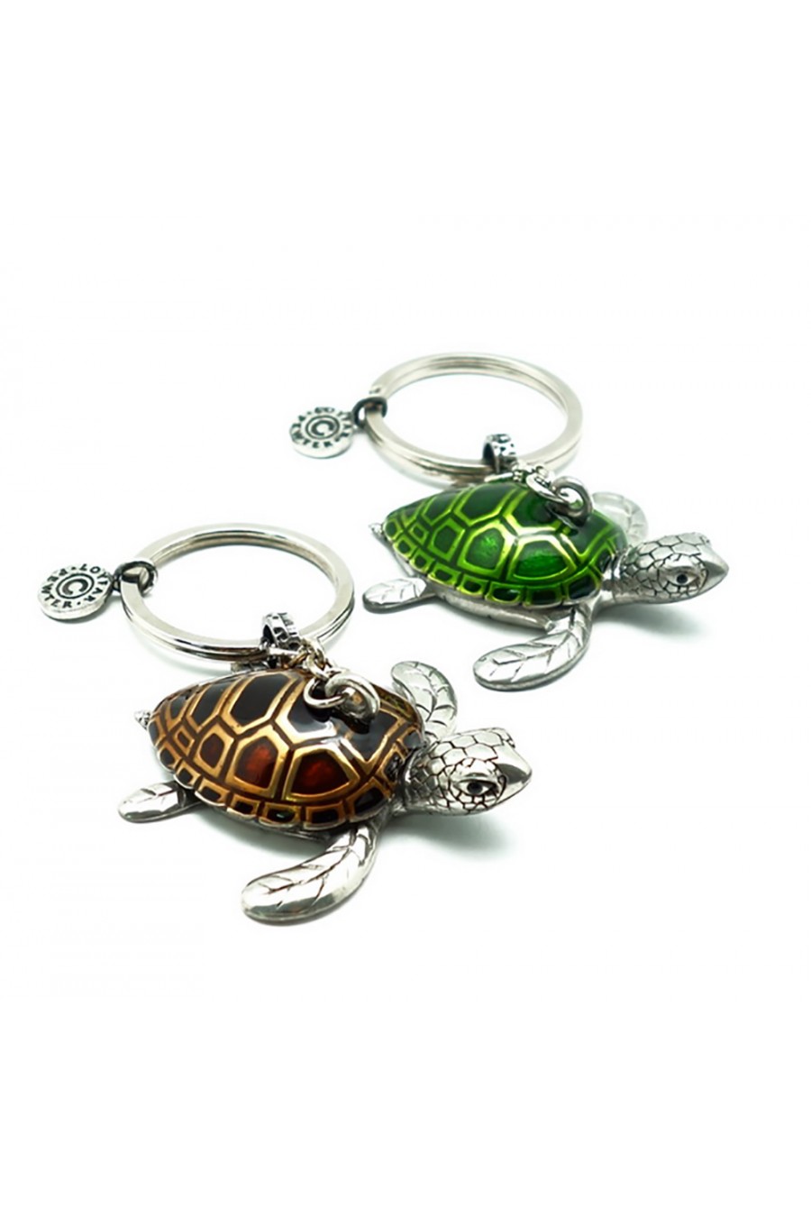 Chaveiro tartaruga em liga de estanho. Acabamento polido natural e decorado em esmalte verde ou laranja translúcido. O presente perfeito para os amantes do mar.