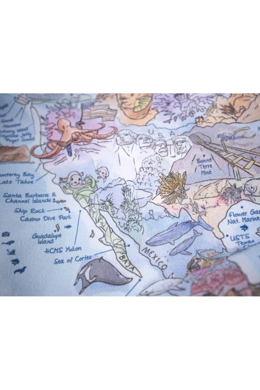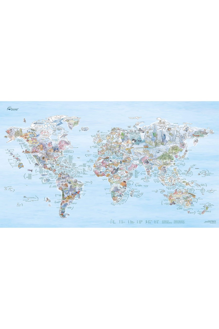 Esta toalha mostra os melhores lugares do mundo para mergulhar. Mais de 500 locais de mergulho, informações sobre o tipo de mergulho e características. Do notável macro do Estreito de Lembeh aos mergulhos com tubarões nas Bahamas e naufrágios no Mar Vermelho. Inspire-se e planeje sua próxima viagem de mergulho com estilo.