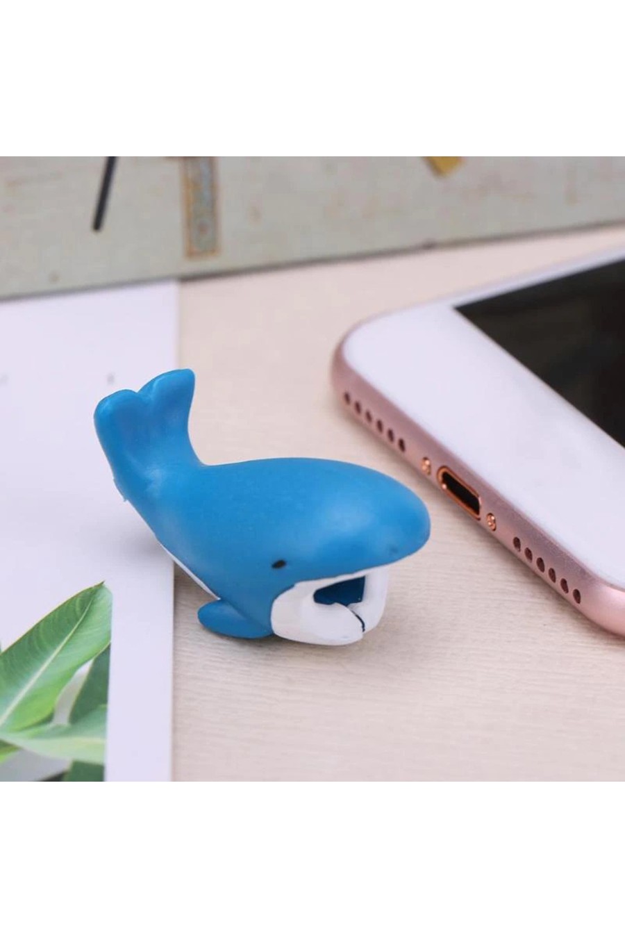 Divertidos y originales protectores de cables con 7 diferentes formas: Tiburón ballena, Pez payaso, Tiburón gris, Delfín, Tiburón azul, Ballena y Foca.