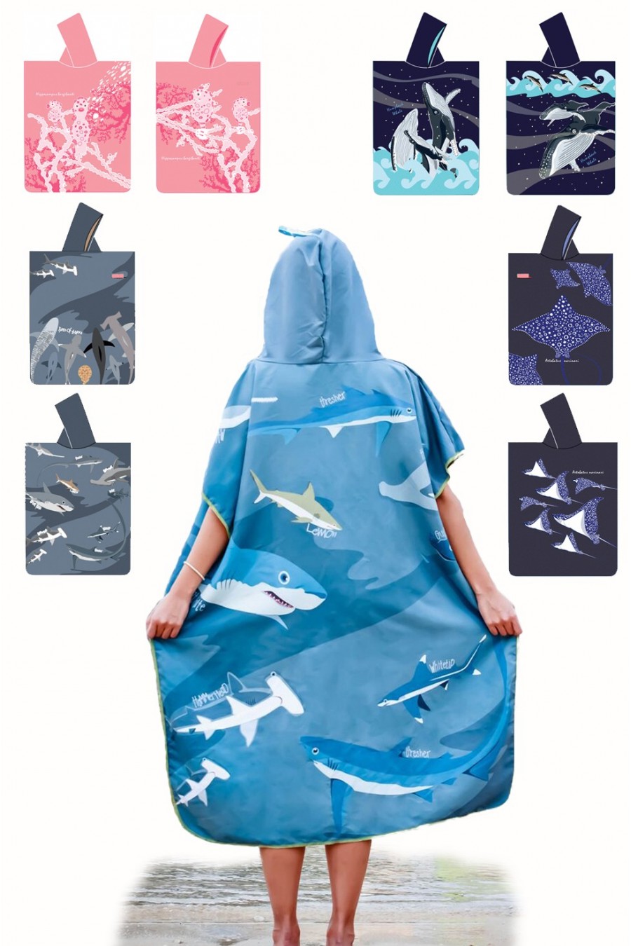 Cada uno de sus cuatro modelos están decorados con un dibujo en la parte delantera diferente al de la trasera. Todos ellos impresionantes inspirados en tus animales marinos favoritos: rayas águila, tiburones, ballenas jorobadas o caballitos de mar.